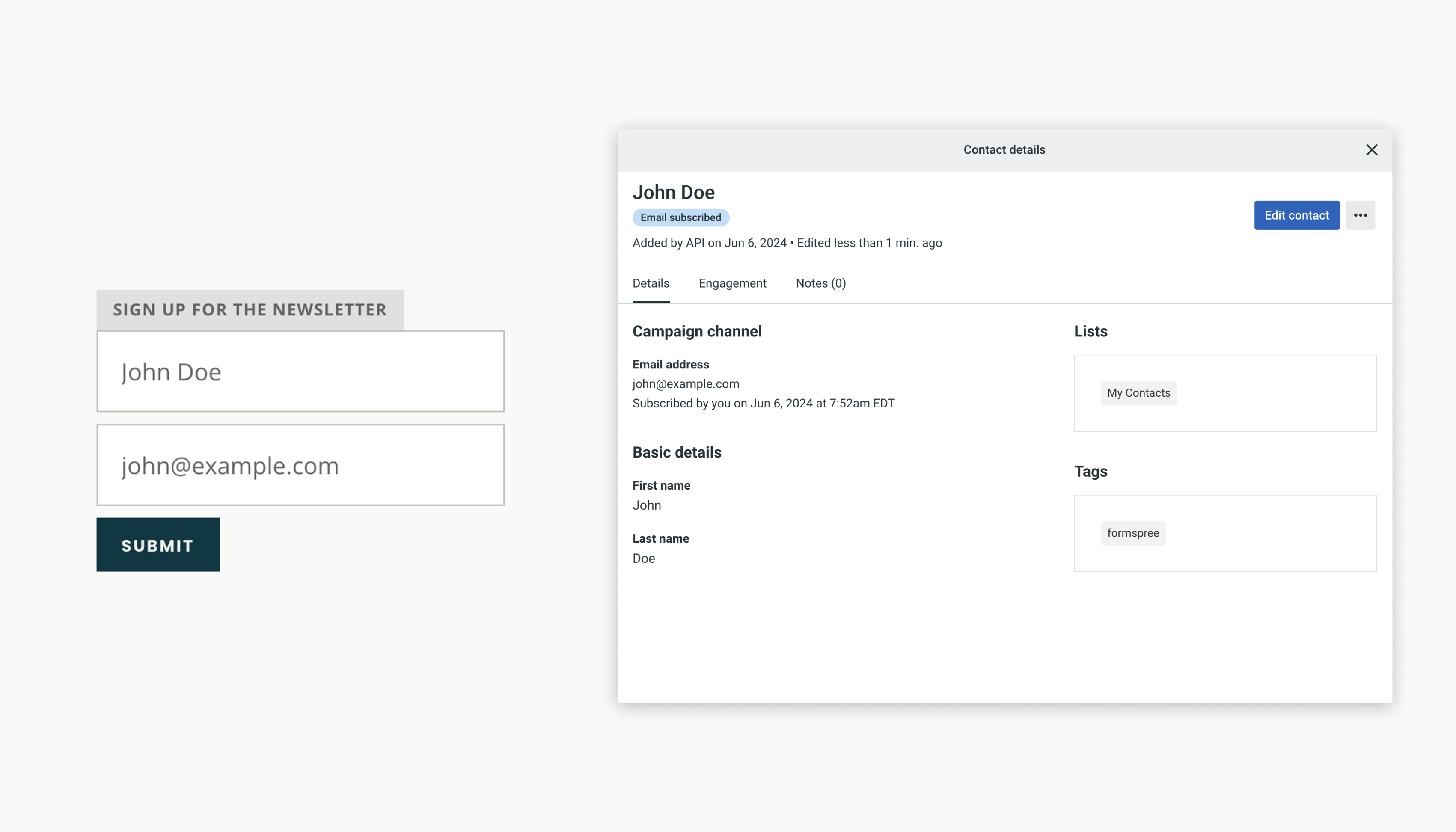 New form submissions will automatically add new contacts to your chosen list, capturing essential details like name and email address, keeping your marketing efforts organized and efficient. Read the docs to learn more about the plugin!