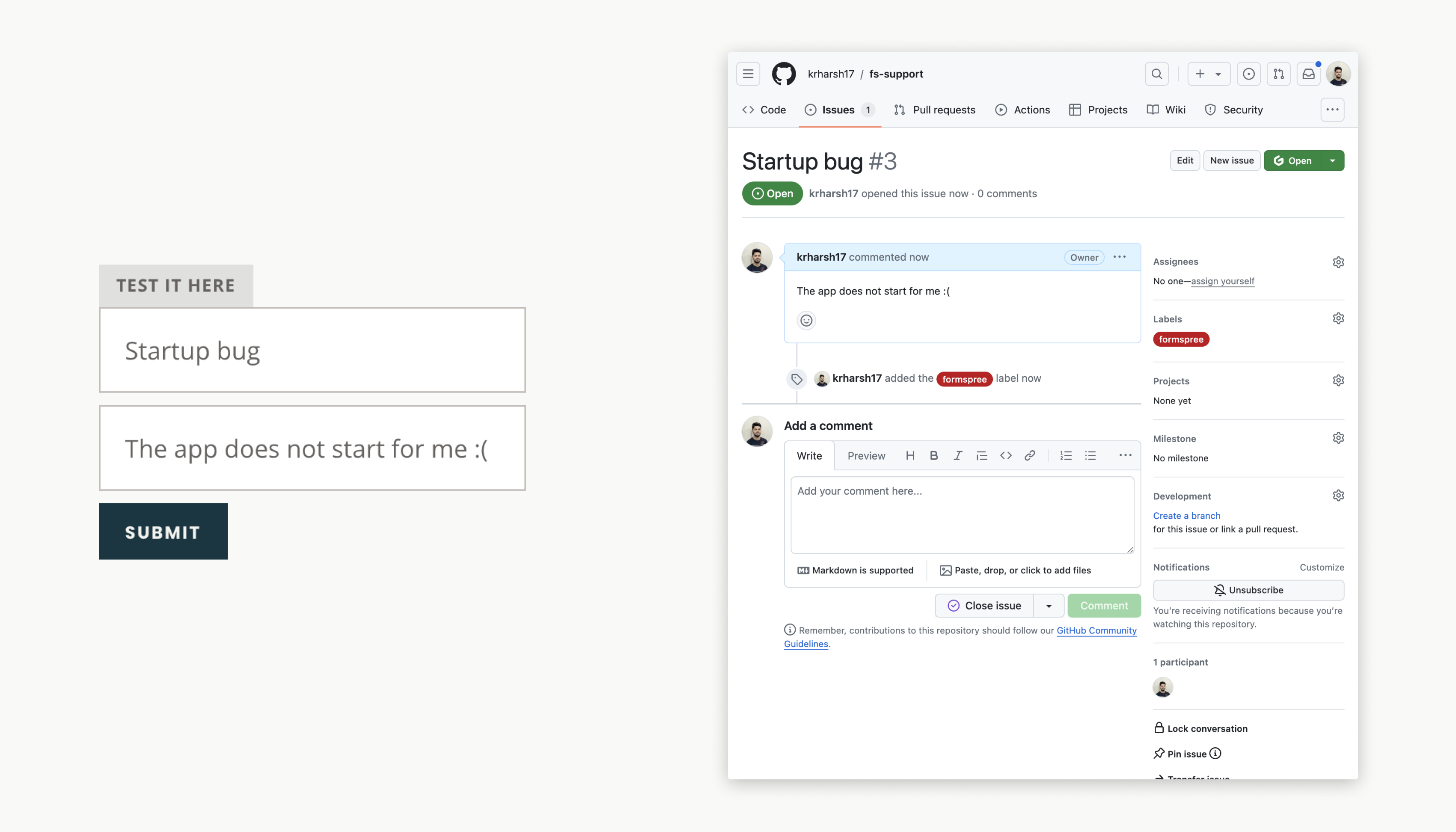 And you’re done! You can now try submitting the form with fields named “subject” (for the issue title) and “message” (for the issue description) and see the new issue in your chosen repository: